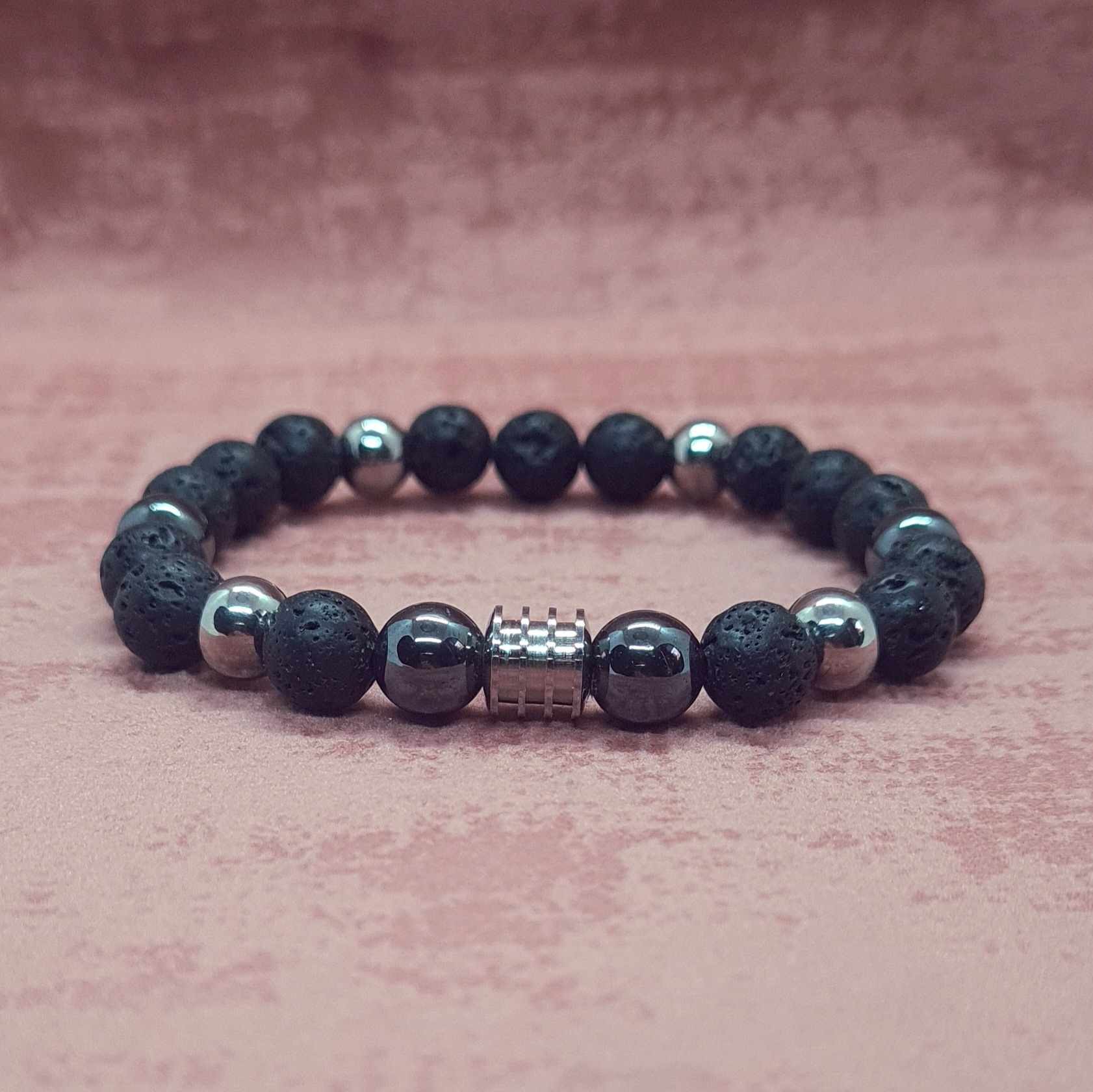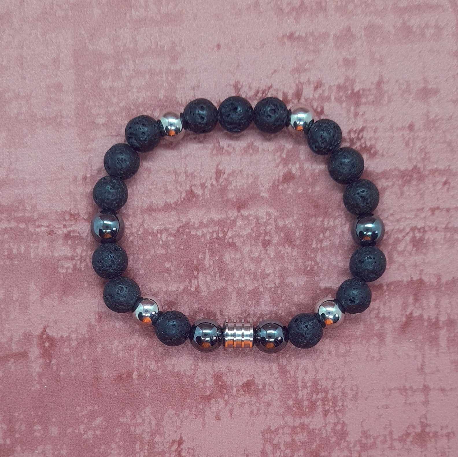 Bracelet homme en pierres naturelles de Lave et Hématite avec fil élastique 7 brins doublé.