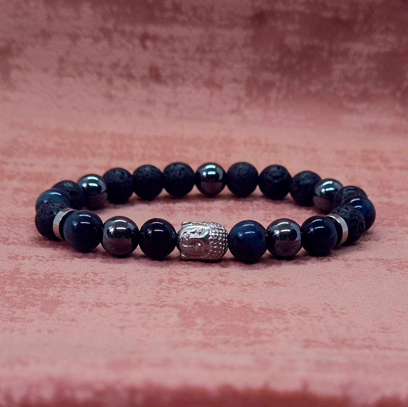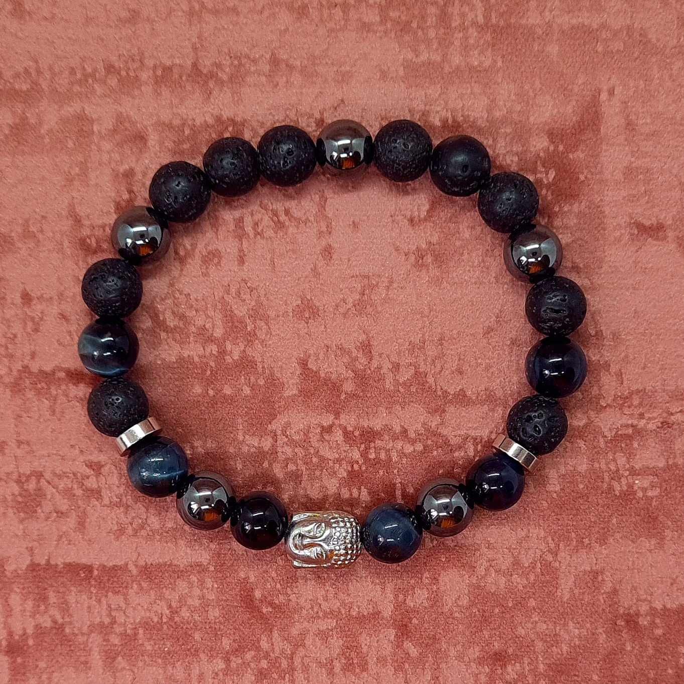 Bracelet mixte en pierres naturelles Oeil de faucon, Pierre de lave, Hématite avec fil élastique 7 brins doublé.