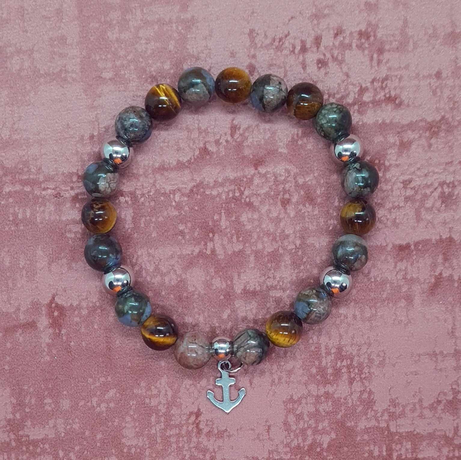 Bracelet mixte en pierres naturelles Oeil de tigre, Rhyolite avec fil élastique 7 brins doublé.
