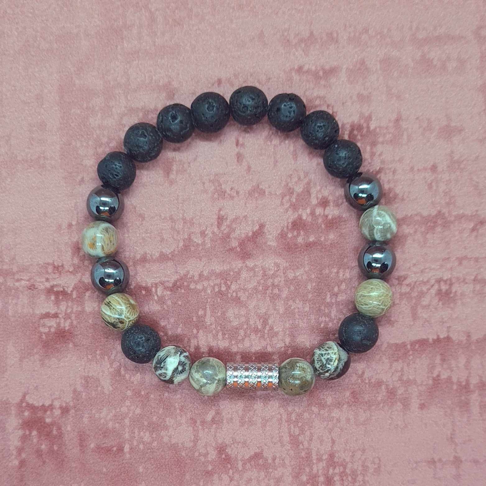 Bracelet mixte en pierres naturelles de 8 mm d'Agate fossile, Pierre de lave, Hématite avec fil élastique 7 brins doublé.