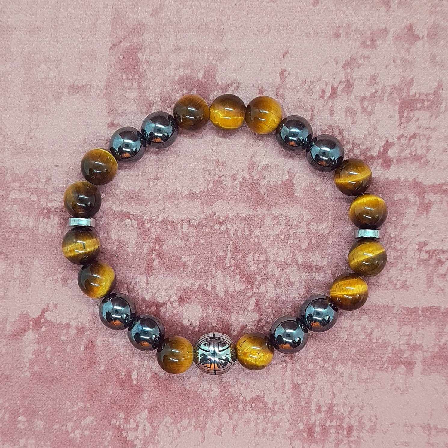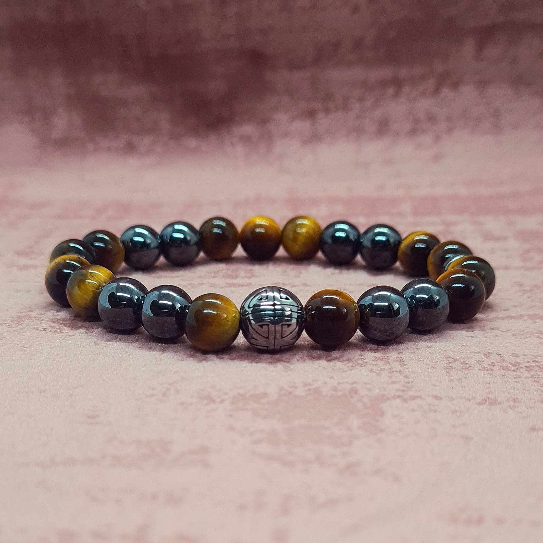 Pierres naturelles de 8 mm - Oeil de tigre et Hématite avec fil élastique 7 brins doublé.