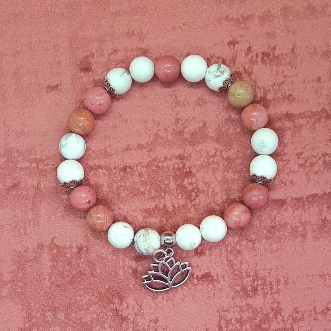 Pierres naturelles de 8 mm - Rhodonite et Howlite avec fil élastique 7 brins doublé.