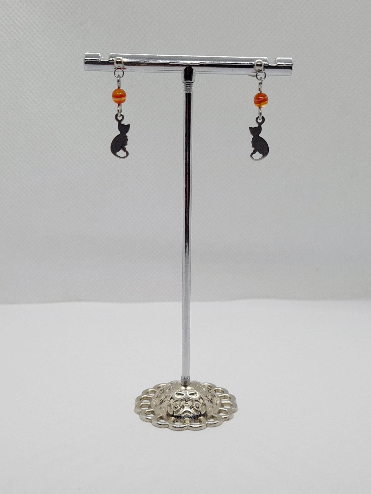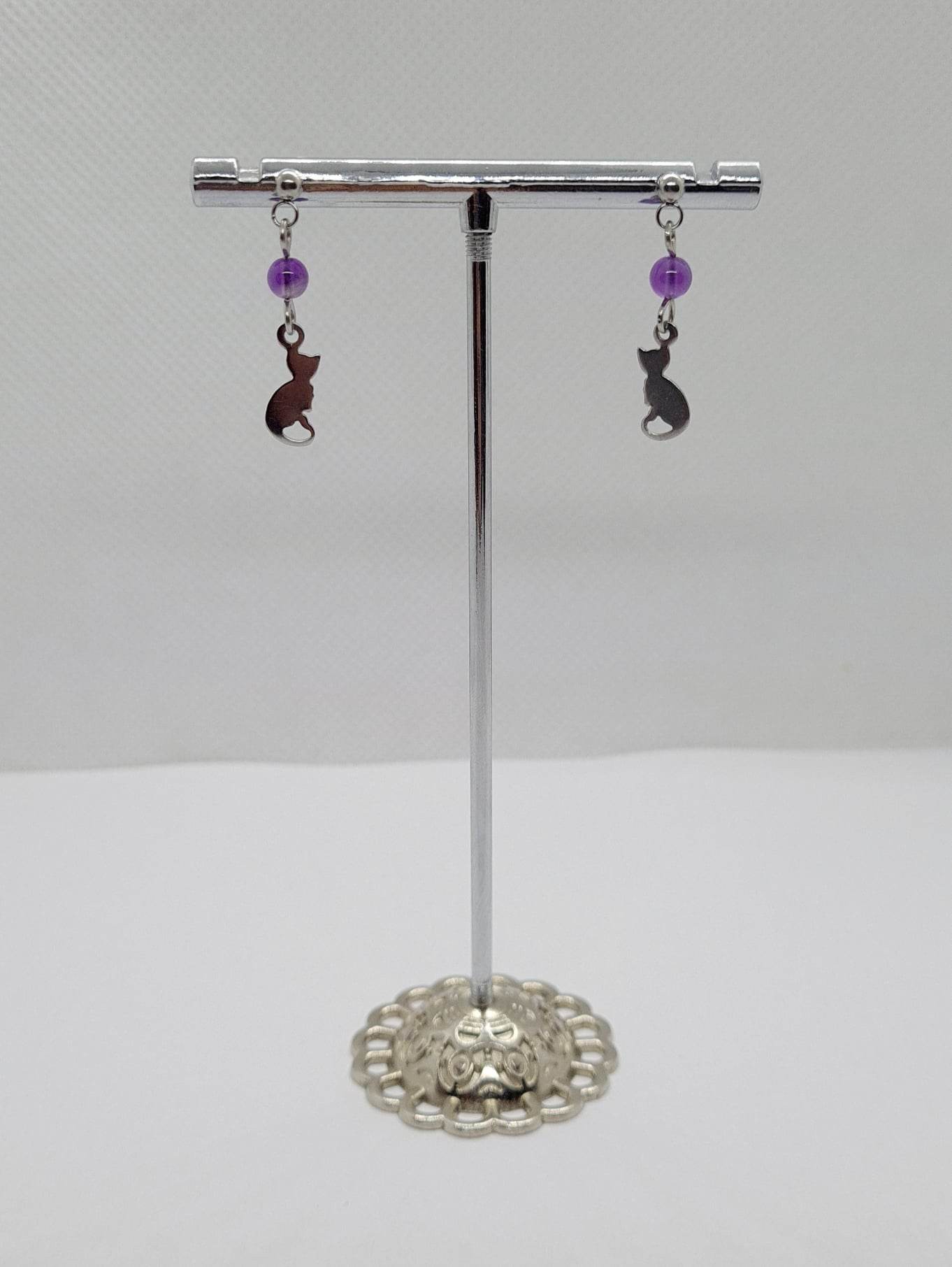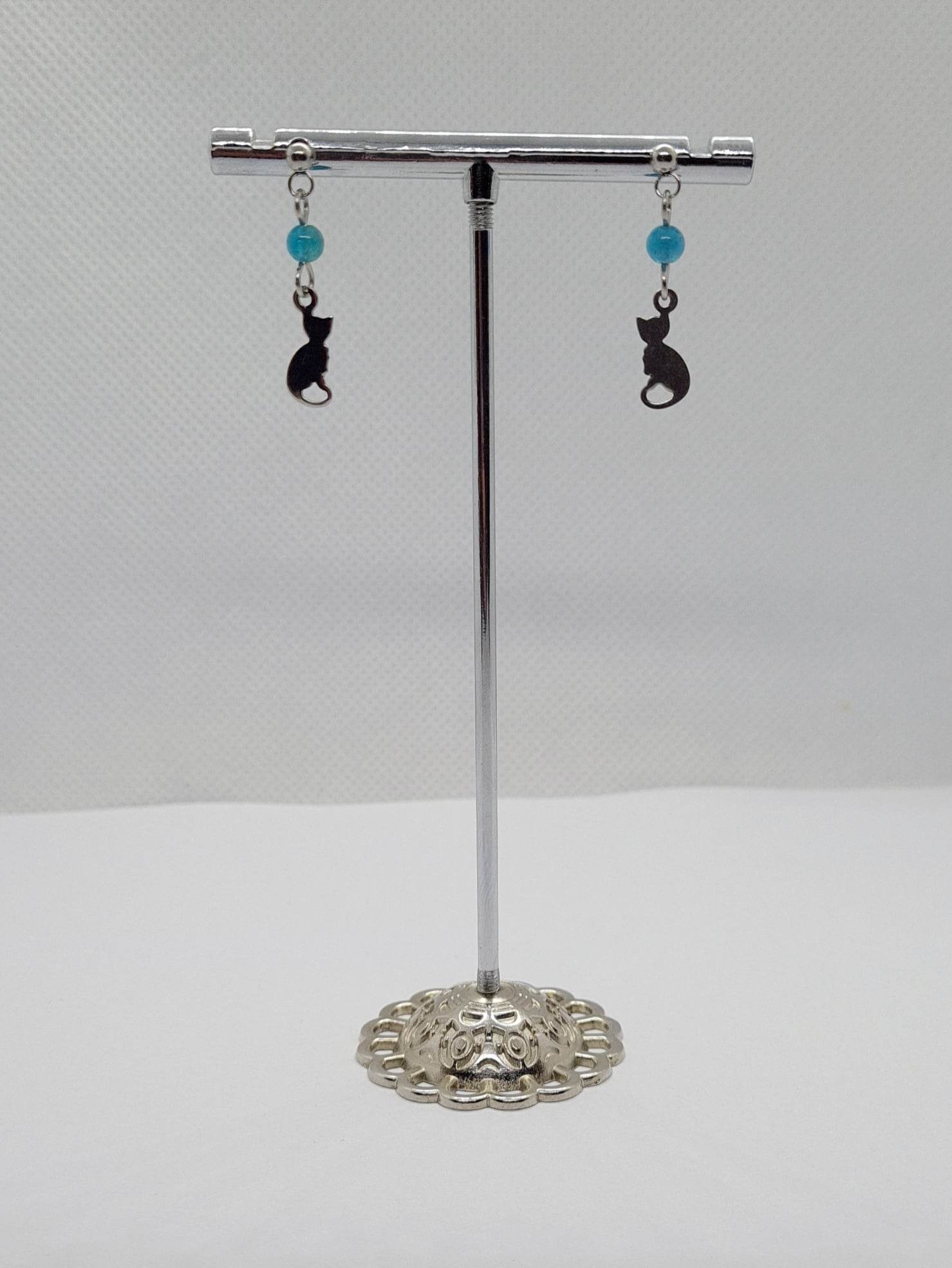 Boucle d'oreille chat en acier inoxydable et pierre naturelle.