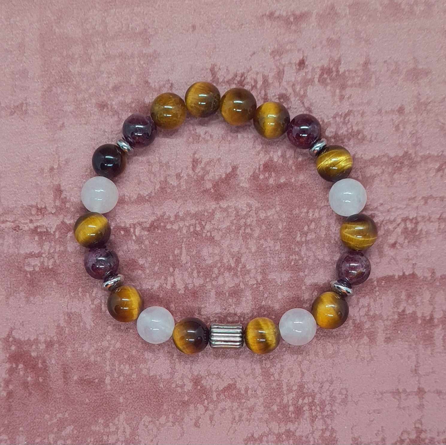Bracelet en pierres naturelles de Quartz rose, Grenat Almandin et Oeil de tigre