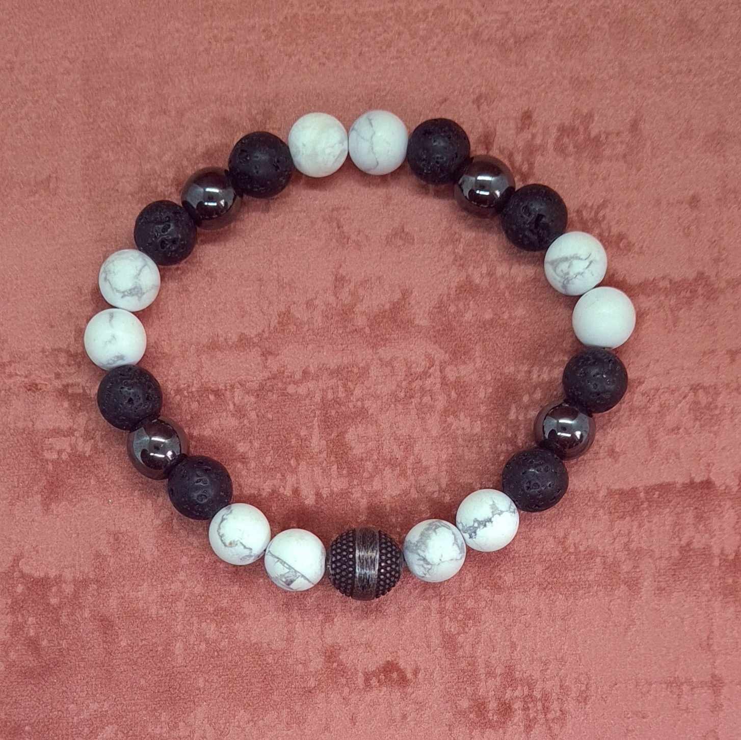 Bracelet en pierres naturelles de Howlite, Lave et Hématite de 8 mm avec élastique 7 brins doublé.