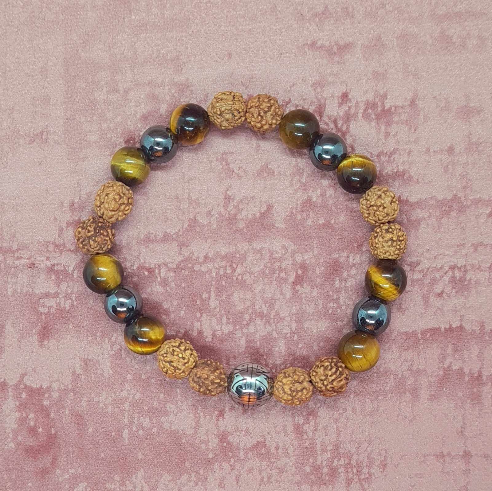 Bracelet en pierres naturelles de Oeil de tigre et Rudrashka et Hématite de 8 mm avec élastique 7 brins doublé.