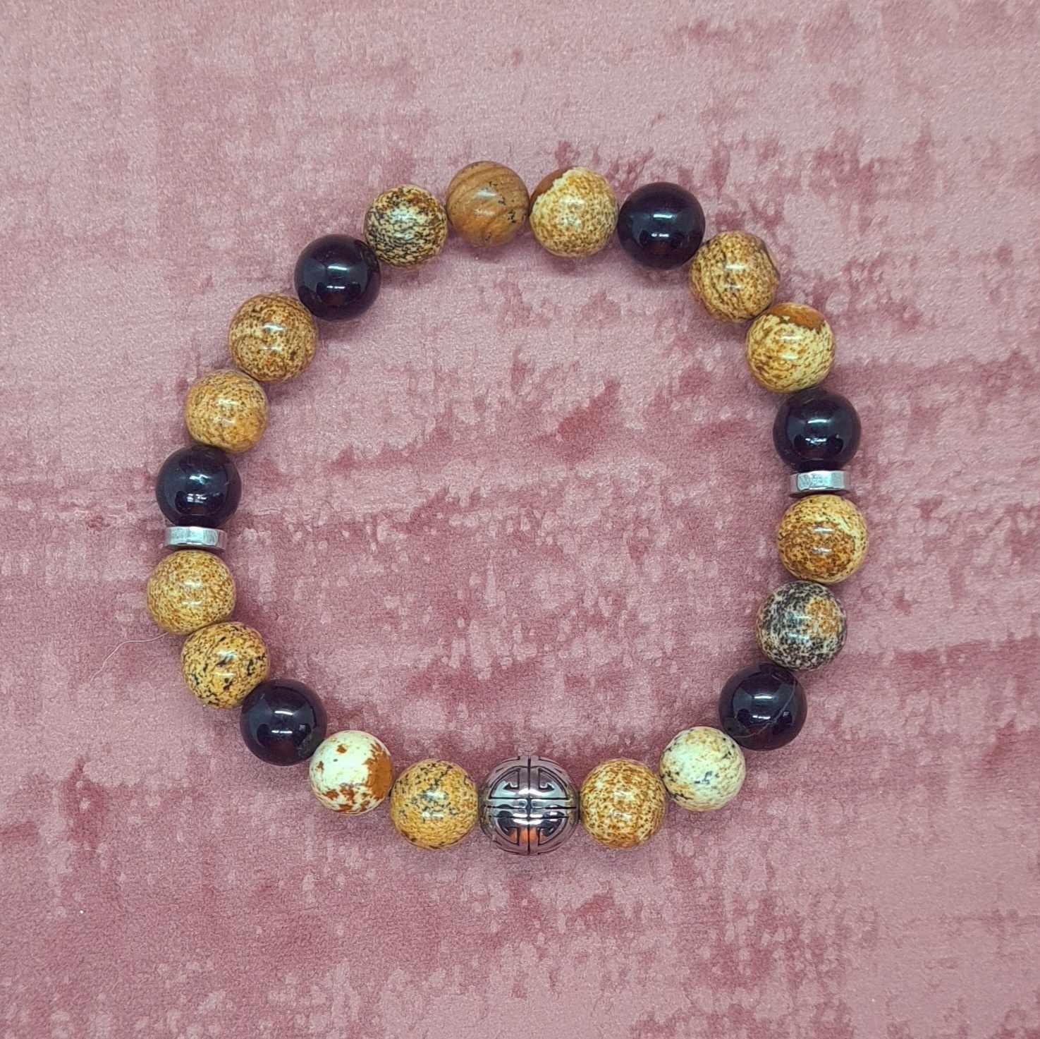 Bracelet en pierres naturelles de Jaspe paysage et Tourmaline noire de 8 mm avec élastique 7 brins doublé.