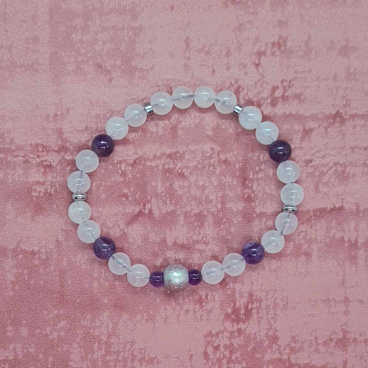 Pierres naturelles de 4 mm et 6 mm - Quartz rose et améthyste - avec fil élastique 7 brins doublé.
