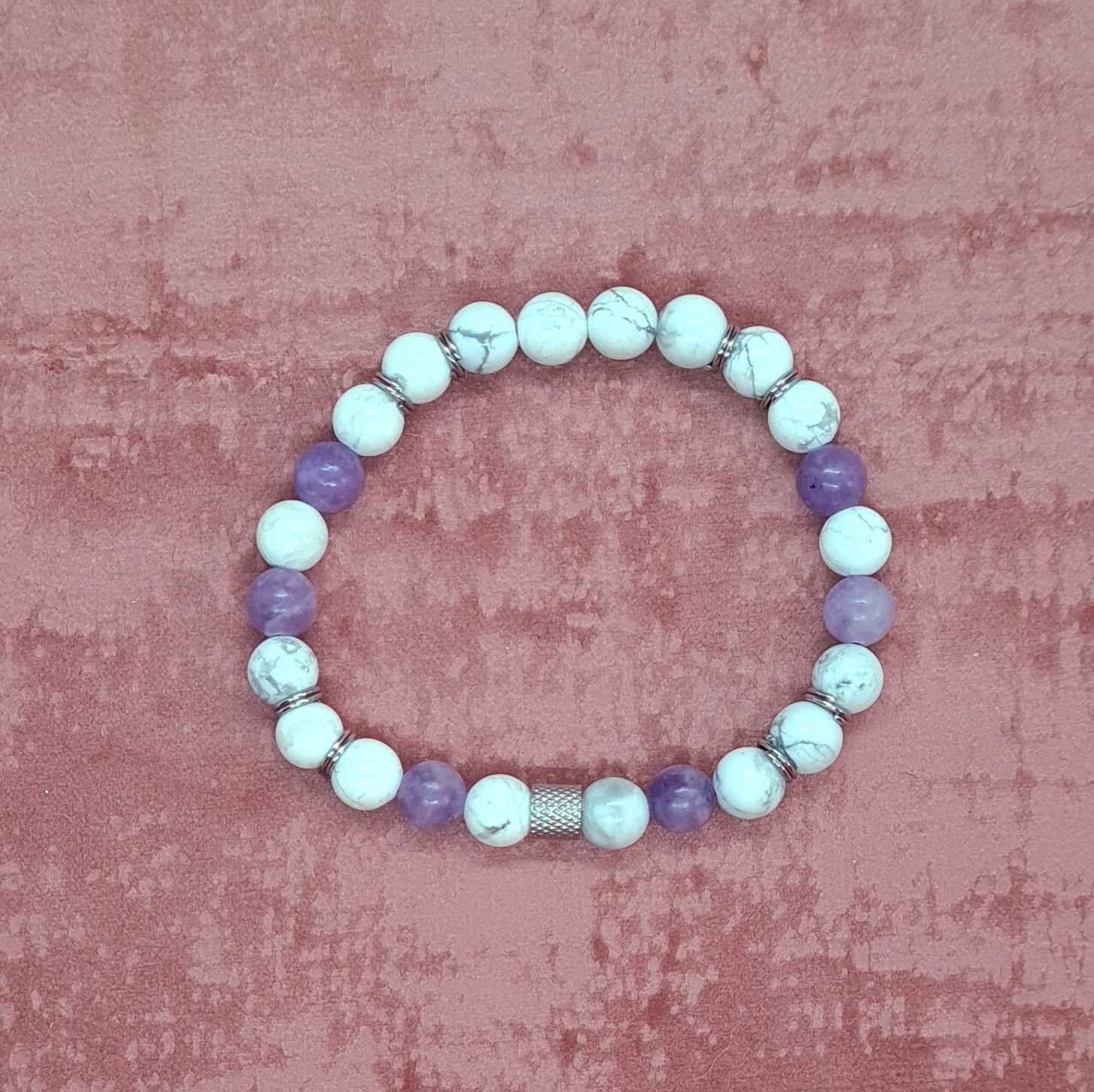 Bracelet en pierres naturelles de Lépidolite et Howlite de 6 mm avec élastique 7 brins doublé.