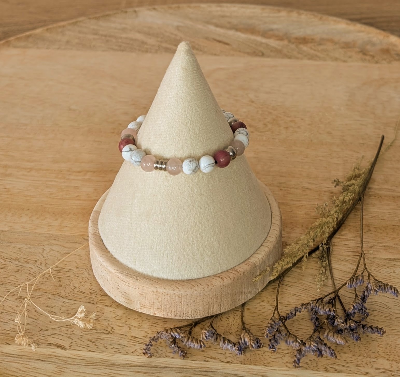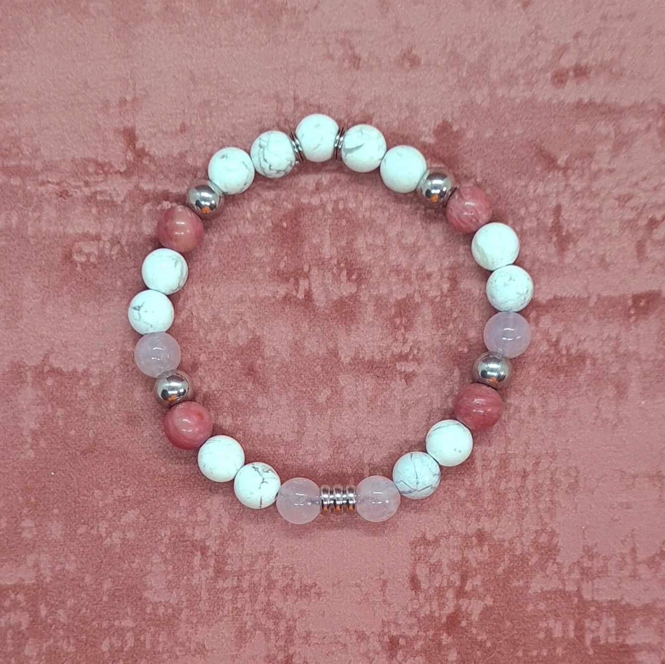 Bracelet en pierres naturelles de Rhodonite, Quartz rose et Howlite de 6 mm avec élastique 7 brins doublé.