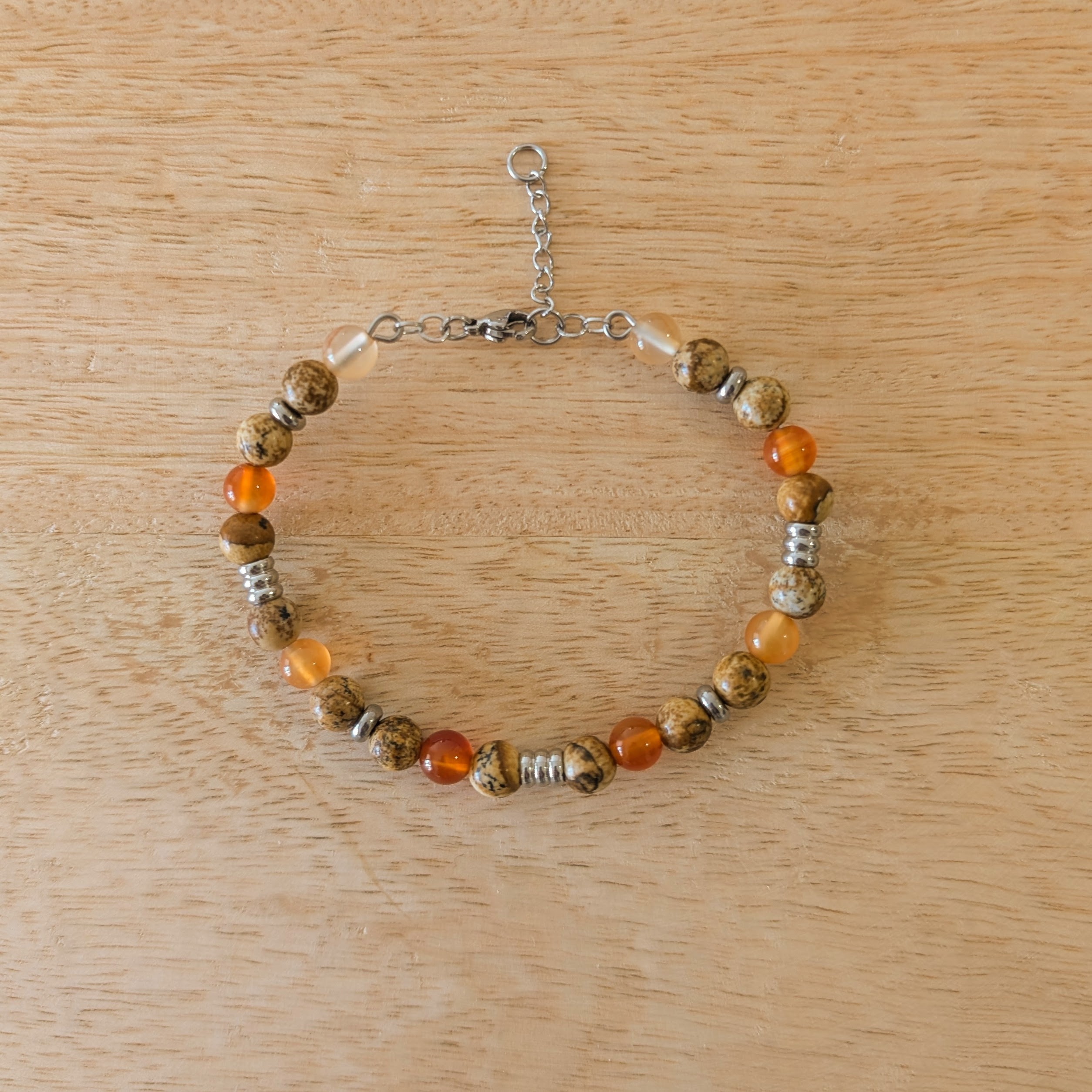 Bracelet en pierres naturelles de Cornaline et Jaspe paysage avec un fil d'acier inoxysable et chaine d'extention pour mieux s'adapter au poignet.