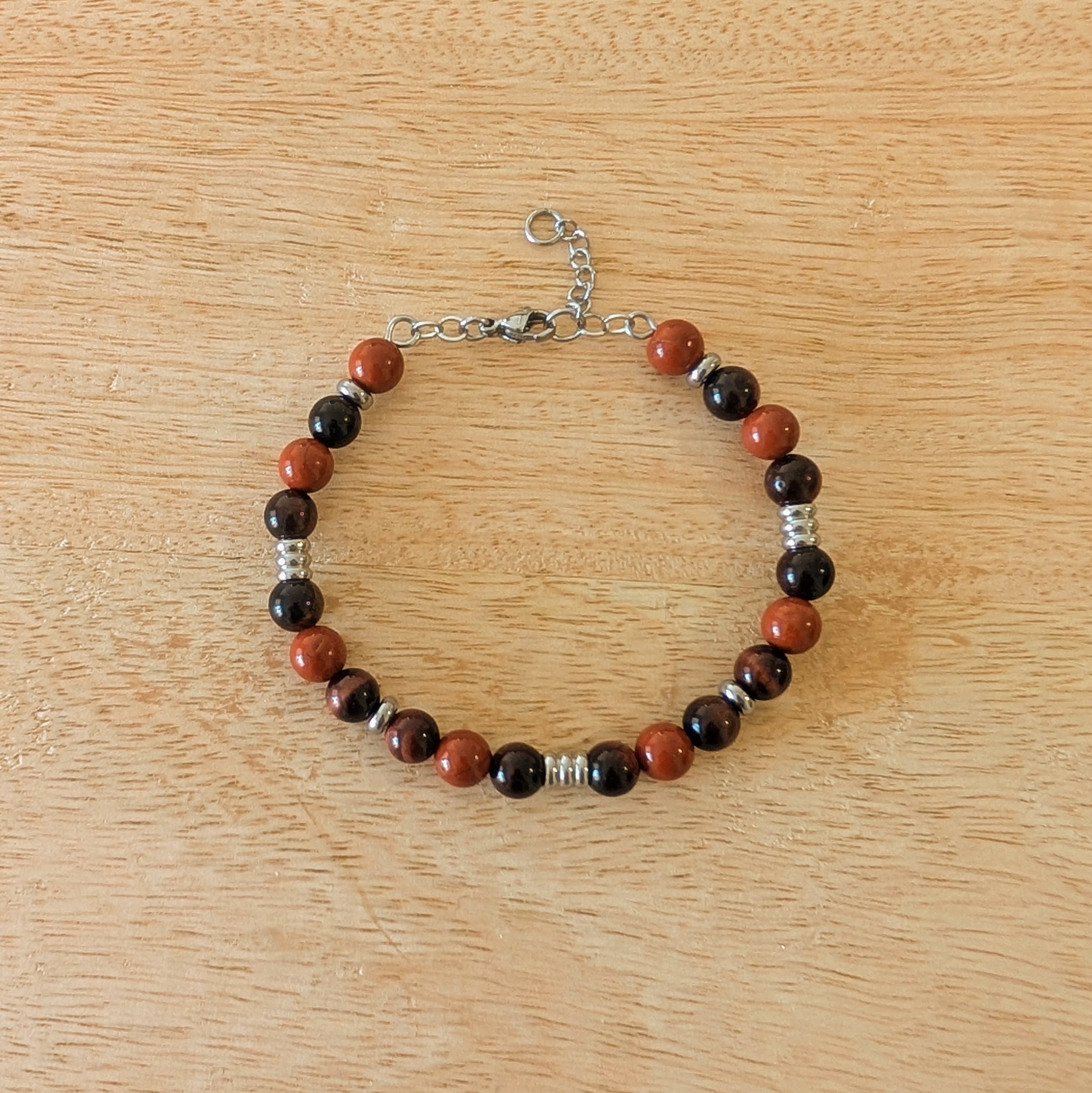 Bracelet en pierres naturelles de Oeil de taureau et Japse rouge avec un fil d'acier inoxysable et chaine d'extention pour mieux s'adapter au poignet.